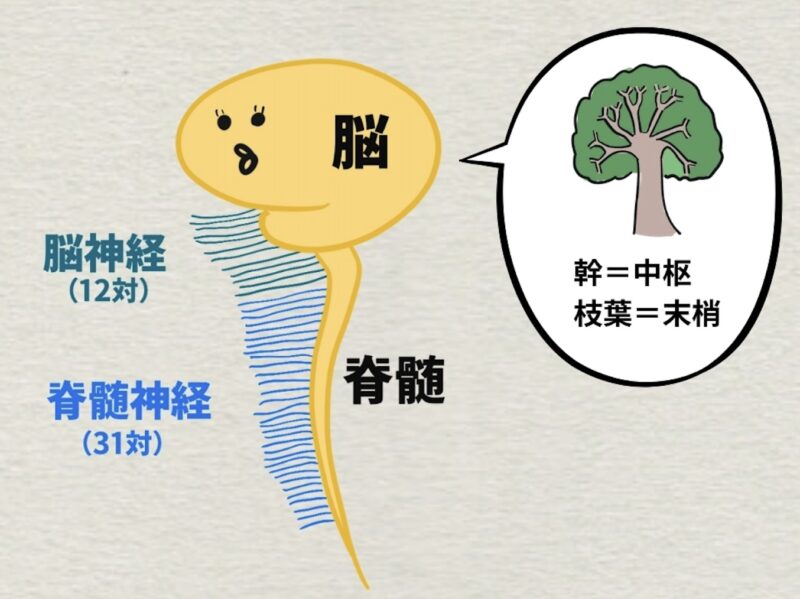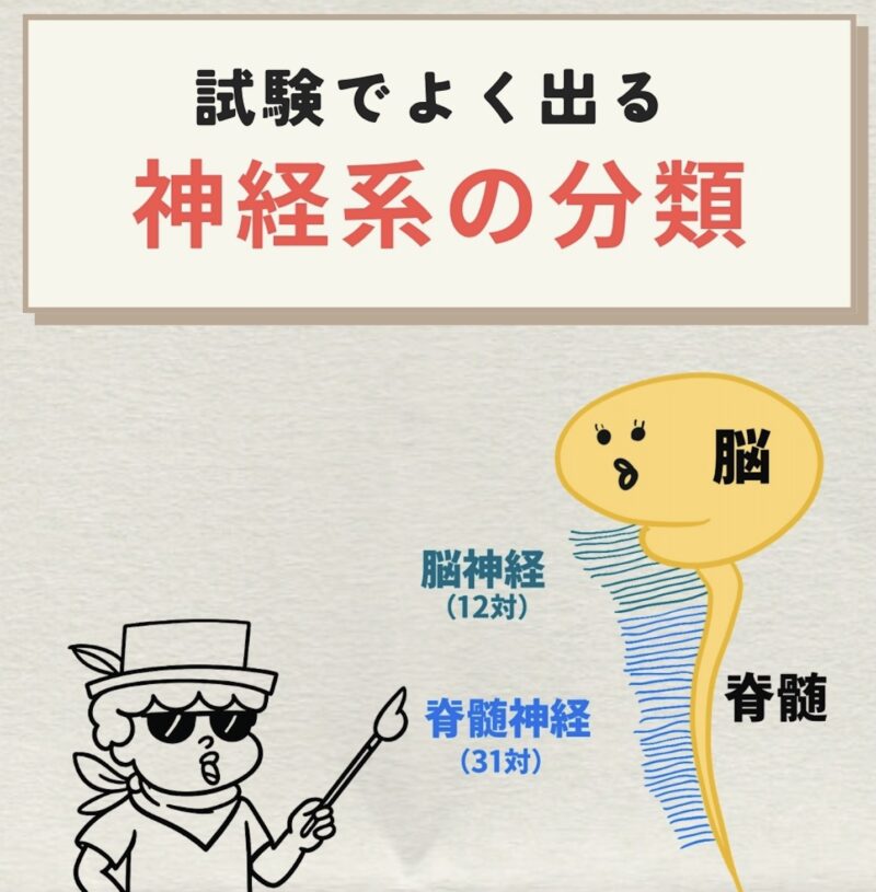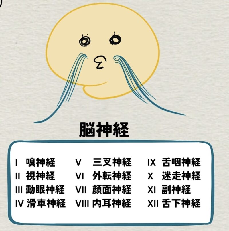 - 脳神経 → 12対(嗅神経、視神経、動眼神経、三叉神経、顔面神経、迷走神経など)
