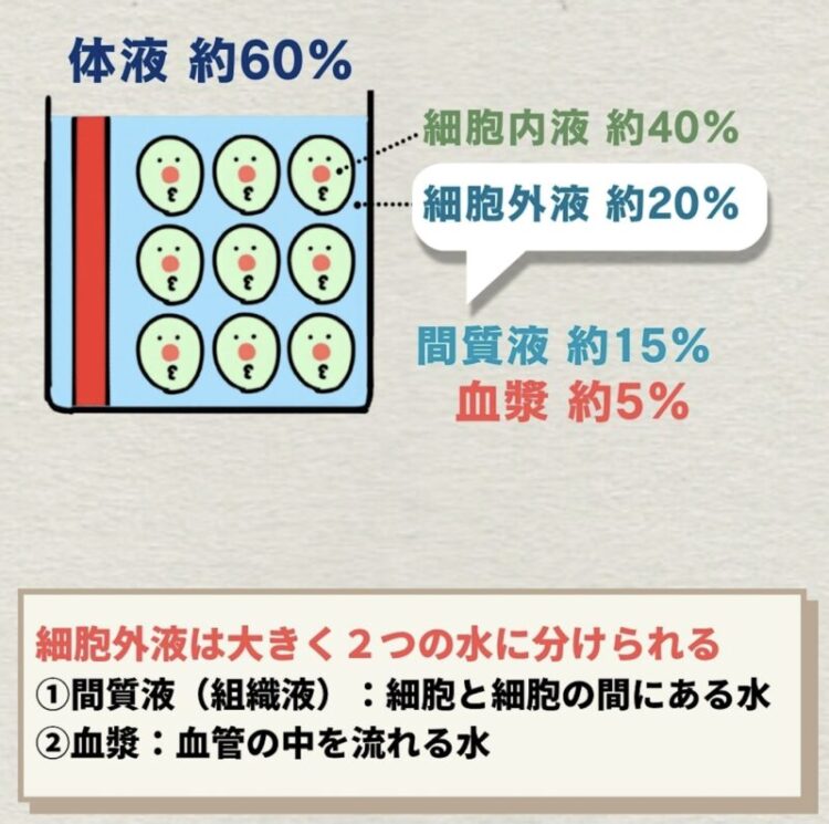 - 細胞外液:細胞の外にある水分(体重の約20%)