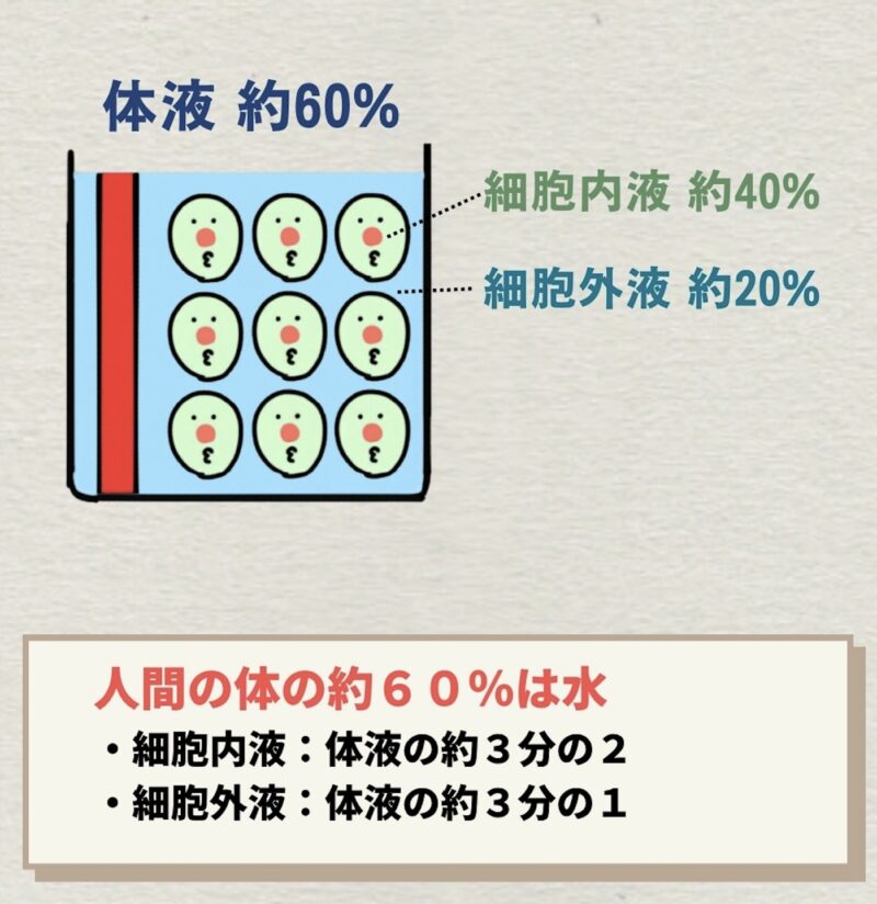 - 細胞内液:細胞の中にある水分(体重の約40%)